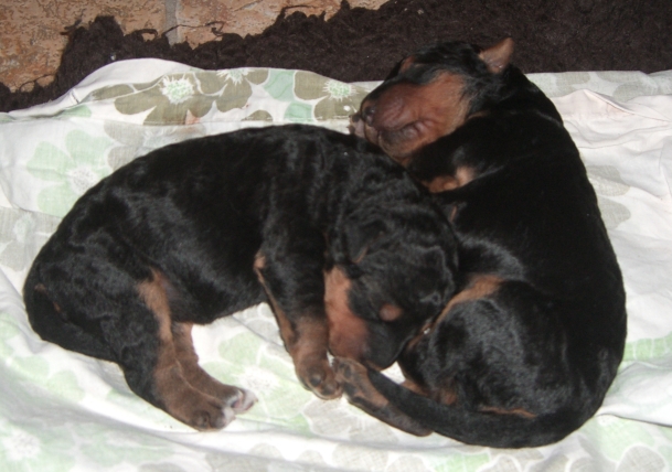 18.08.2012: Jona versorgt ihre Zwillinge bestens. Der Tagesablauf besteht aus Trinken und Schlafen. Di Welpen haben ein reichliches Nahrungsangebot. Mama Jona ist sehr fürsorglich. Unsere Mithilfe bei der Aufzucht beschränkt sich zur Zeit auf "Betten machen"