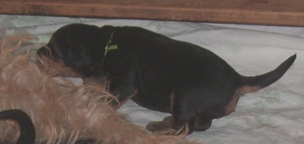 31.10.2011: Schon wieder eine Woche vorüber. Es gibt beinahe jeden Tag Neues zu entdecken. Allmählich kommen die Welpen "auf die Füße. Die Äuglein öffnen sich. Die Welpen reagieren auf Geräusche und...sie haben mächtig Hunger!!! Heute war die erste Wurmkur fällig. Das Gespucke war groß. Mamas Milch kommt deutlich besser an.