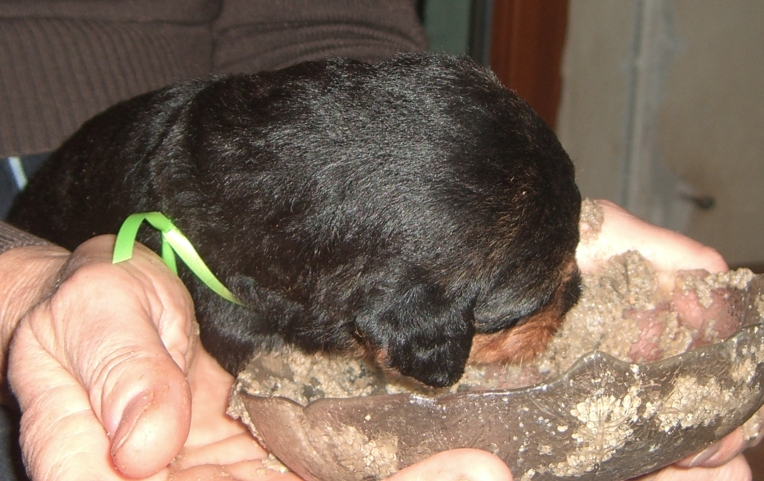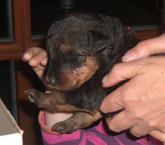 03.11.2012: Die Welpen schlafen immer noch die meiste Zeit. Aber die Entwicklung geht mit Riesenschritten voran. Die Sinne erwachen immer mehr. Die Welpen können mit ihren gerade geöffneten Augen zwar noch nicht richtig sehen, sind aber lichtempfindlich. Deshalb bin ich sehr vorsichtig mit dem Blitz beim Fotografieren und einige Bilder sind daher etwas blass. Aus dem "Robben" ist eindeutig ein Laufen geworden. Das gelingt noch nicht immer richtig gut, so dass die Welpen oft ganz schön "durcheinender purzeln". Man kann Bilder beobachten, dass die Kleinen auf Geräusche und Gerüche reagieren. Sie strecken ihre Näschen nach oben, wenn z.B. Mama Angel naht, oder werden wach, wenn sie etwas hören. Gelegentlich hört man aus der Wurfkiste schon Knurren oder beinahe Bellen und die Welpen beginnen, miteinander zu spielen.
