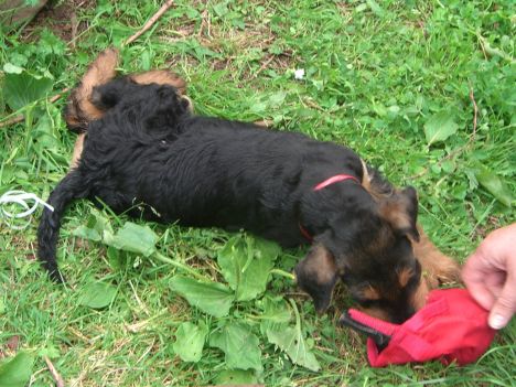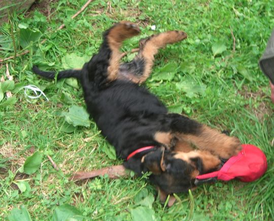 19.07.2015: Die Welpen sind jetzt jeden Tag draußen und haben ihren "Spielplatz" fest im Griff. Sie empfangen dort ihren persönlichen Besuch und beteiligen sich mit Begeisterung an Zerrspielen mit einem alten Geschirrtuch.