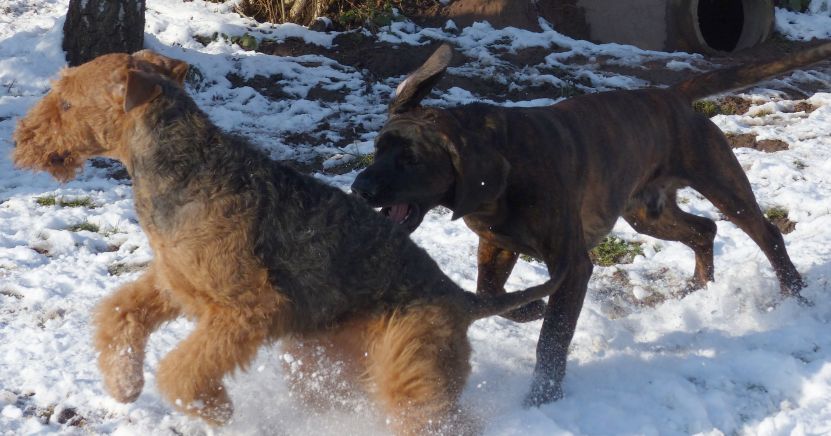 Februar 2018: Schluss mit dem Matsch. Endlich richtiges Winterwetter und Schnee. Die Hunde genießen es.