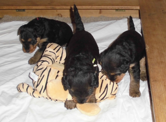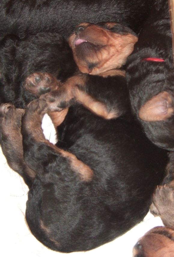 10.05.2013: Die Entwicklung der Welpen geht in Riesenschritten voran. Aus der Wurfkiste hört man Heulen, Knurren, Heulen und Bellen. Ganz wie die Großen nur eindeutig mit "Kinderstimmchen". Das mit dem Laufen auf allen Vieren klappt auch schon immer besser, auch wenn die Kleinen immer wieder durcheinander purzeln. Die erste Maniküre haben die Kleinen hinter sich. Die scharfen Krallen verletzen sonst das empfindliche Gesäuge der Mutter. Auch die erste Wurmkur ist schon erfolgt.