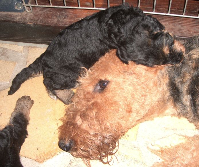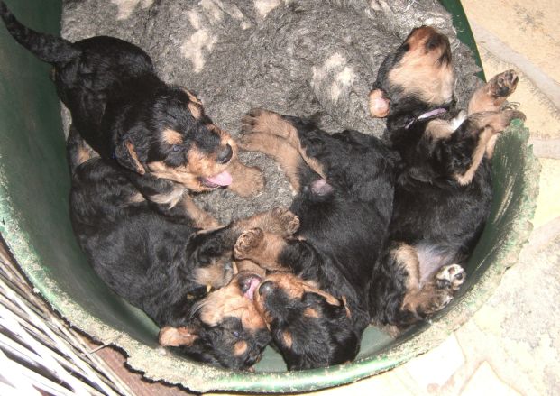 04.08. - 07.08.2014: Die Welpen werden immer entdeckungslustiger. Sie erobern sich immer neue Bereiche. Sie spielen und balgen sich. Außerdem probieren sie ihre wachsenden Zähnchen überall aus. Das zwickt schon ganz schön.