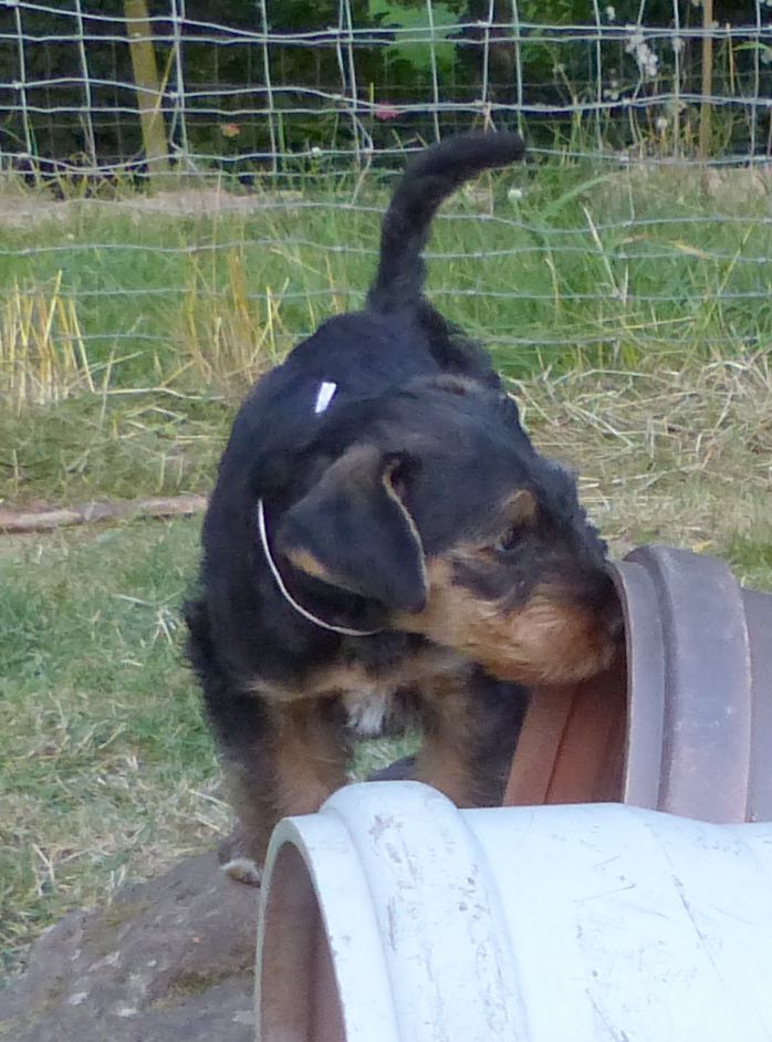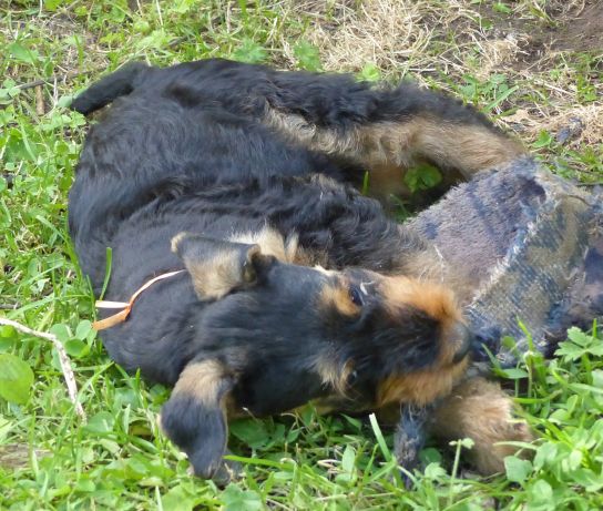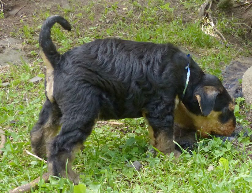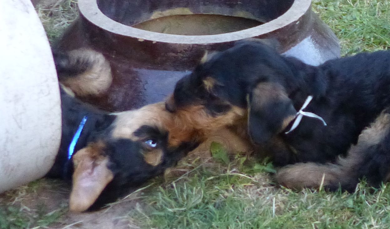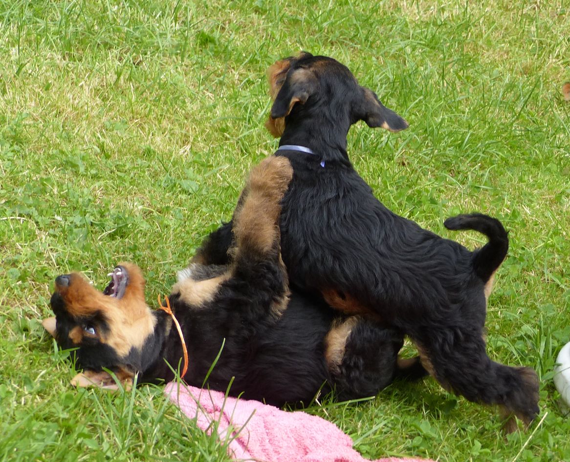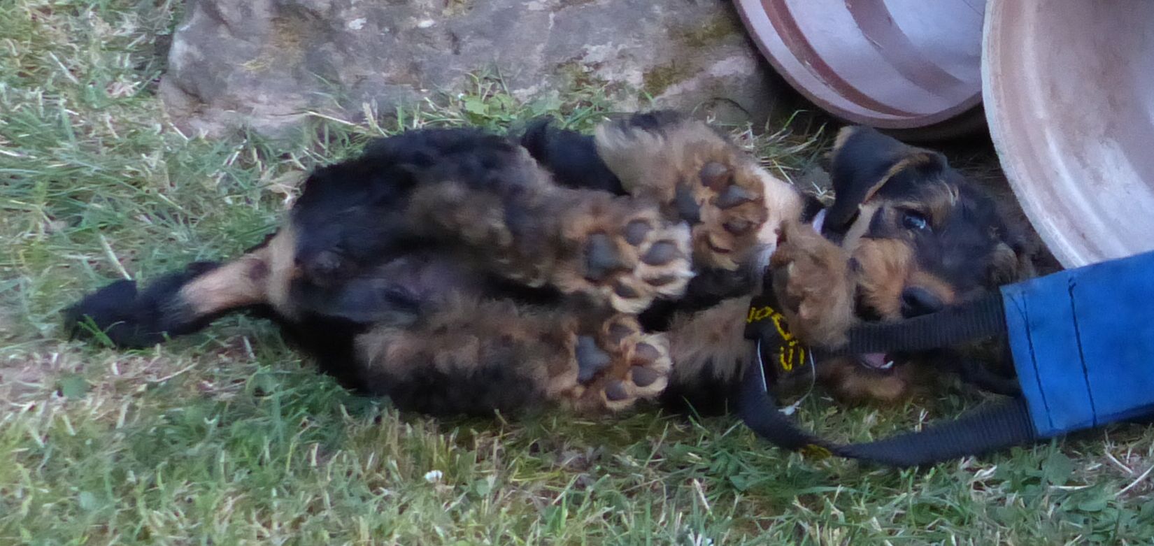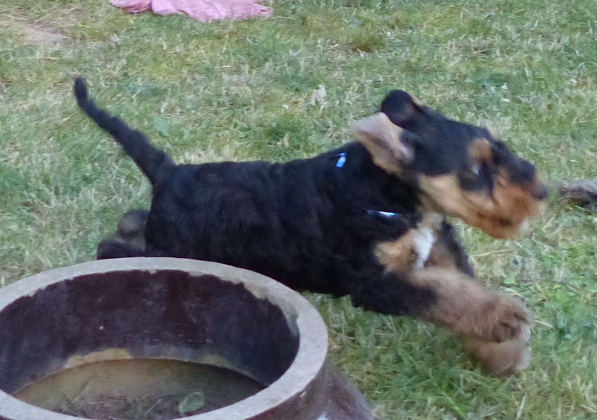 04.07.2016: Die Welpen können es morgens kaum erwarten, endlich nach Draußen zu kommen. Sie haben mittlerweile das gesamte Gelände erkundet und in Beschlag genommen. Auf meiner Terrasse mussten schon einige Hortensien ihre Blüten lassen. Kann man nichts machen.