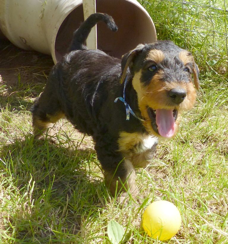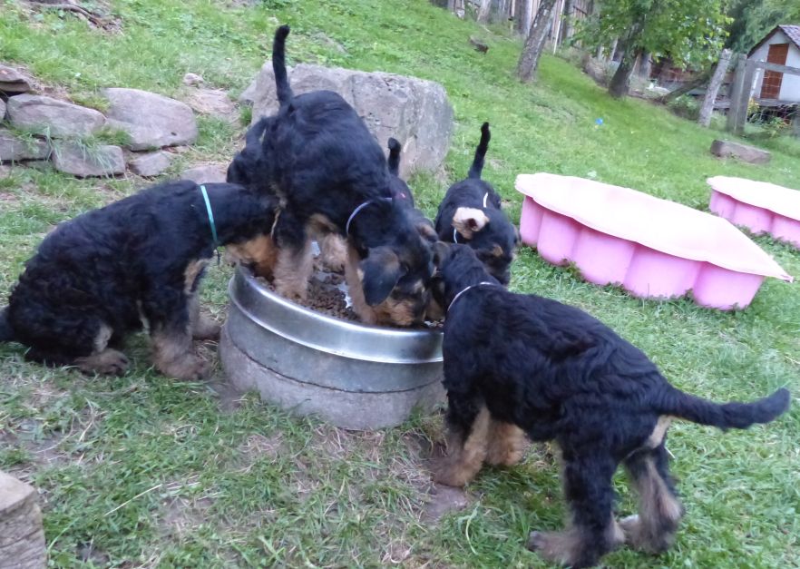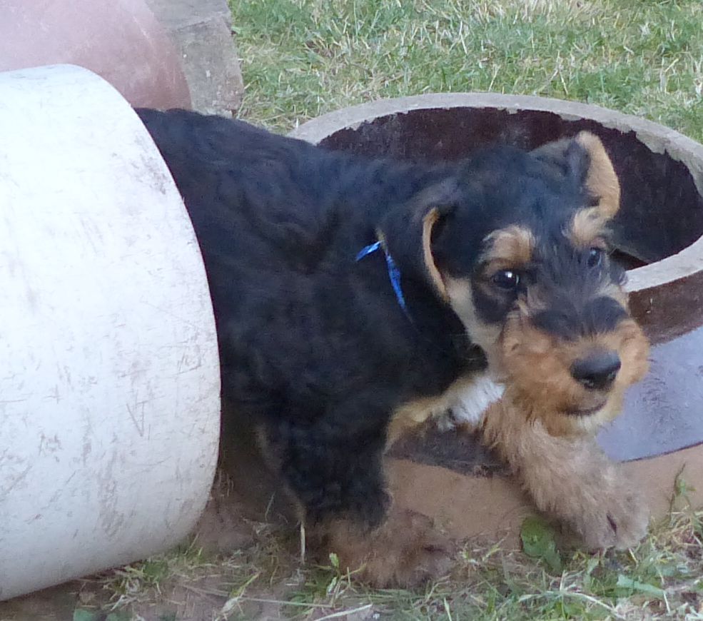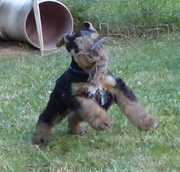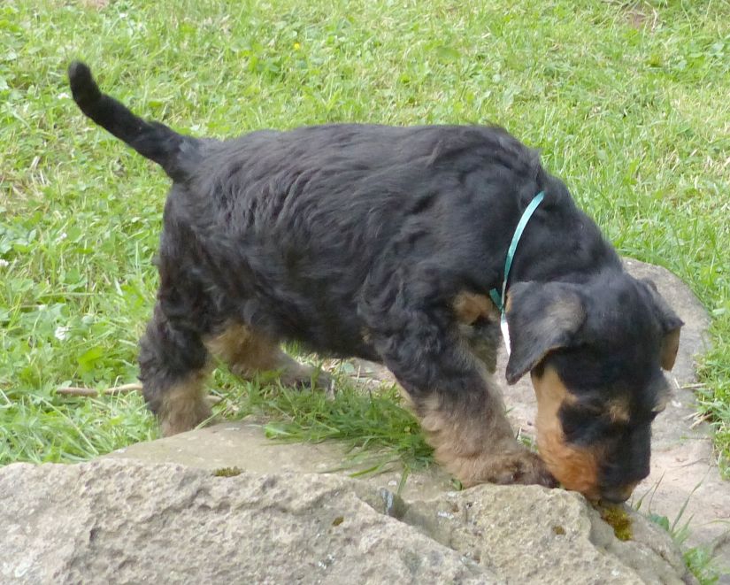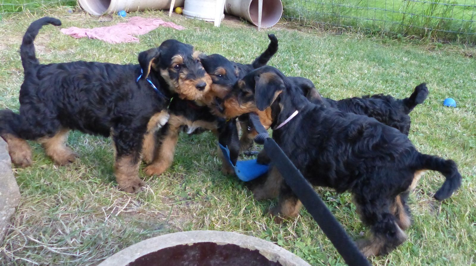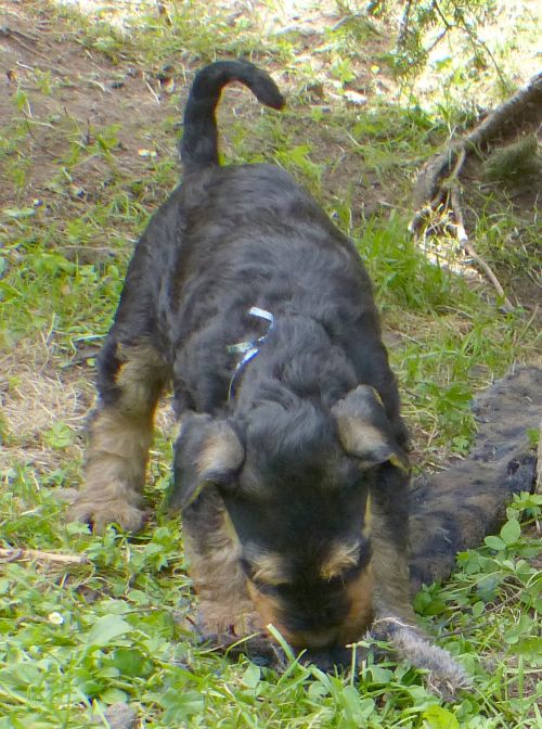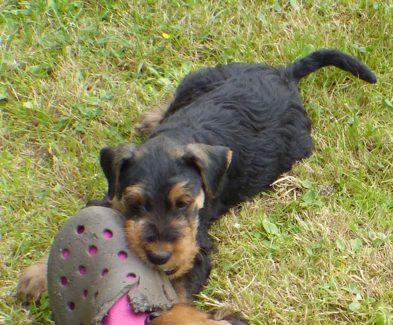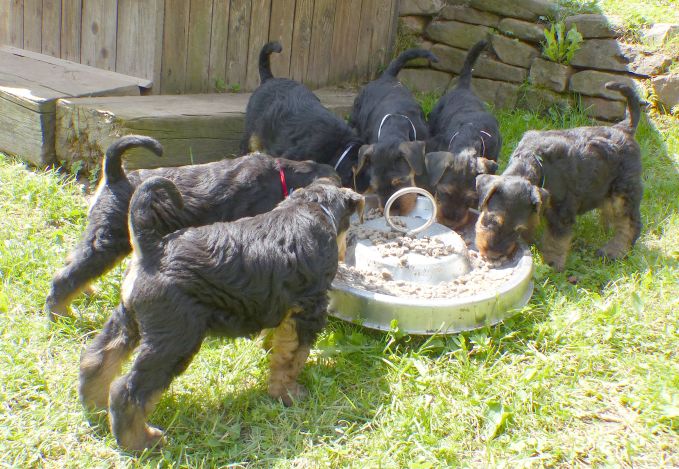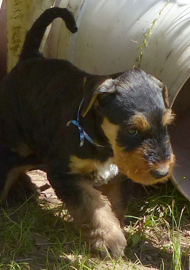 04.07.2016: Die Welpen können es morgens kaum erwarten, endlich nach Draußen zu kommen. Sie haben mittlerweile das gesamte Gelände erkundet und in Beschlag genommen. Auf meiner Terrasse mussten schon einige Hortensien ihre Blüten lassen. Kann man nichts machen.