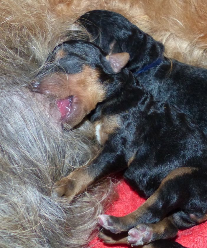 20.05.2016: Alles läuft gut. Momo versorgt und pflegt ihre Welpen bestens. Die Kleinen trinken und schlafen und nehmen täglich an Gewicht zu.