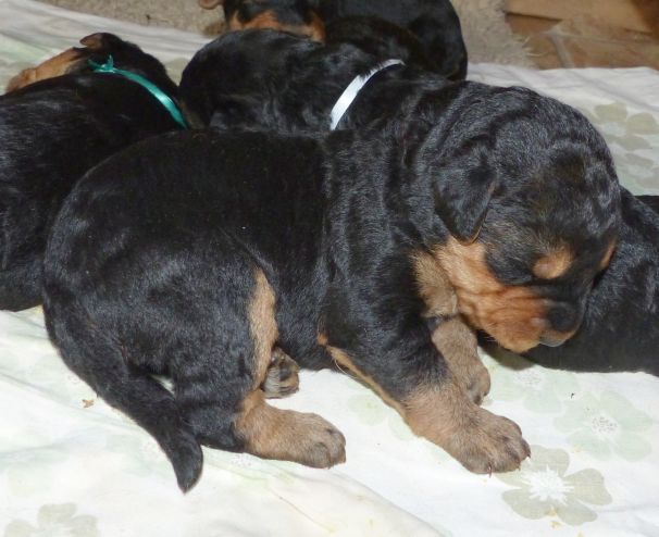 Das Geschehen in der Wurfkiste ist noch nicht besonders abwechslungsreich. Die Welpen trinken und schlafen und trinken und schlafen und ........Sie wachsen und gedeihen prächtig. Joy ist eine phantastische Mutter. Völlig entspannt versorgt und putzt sie ihre Kleinen. Die pure Freude, das mitzuerleben